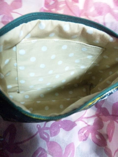 中はベージュドット。消しゴムや細かなものを入れるポケットも付けました。