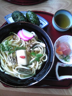 注文したのが一番目の画像で、『那智うどんとめはりセット』。胡麻豆腐入りの山菜うどんにデカイめはり寿司が二個、更には新鮮マグロのお刺身(何故か金箔のせ!)付きーo(^-^o)(o^-^)o